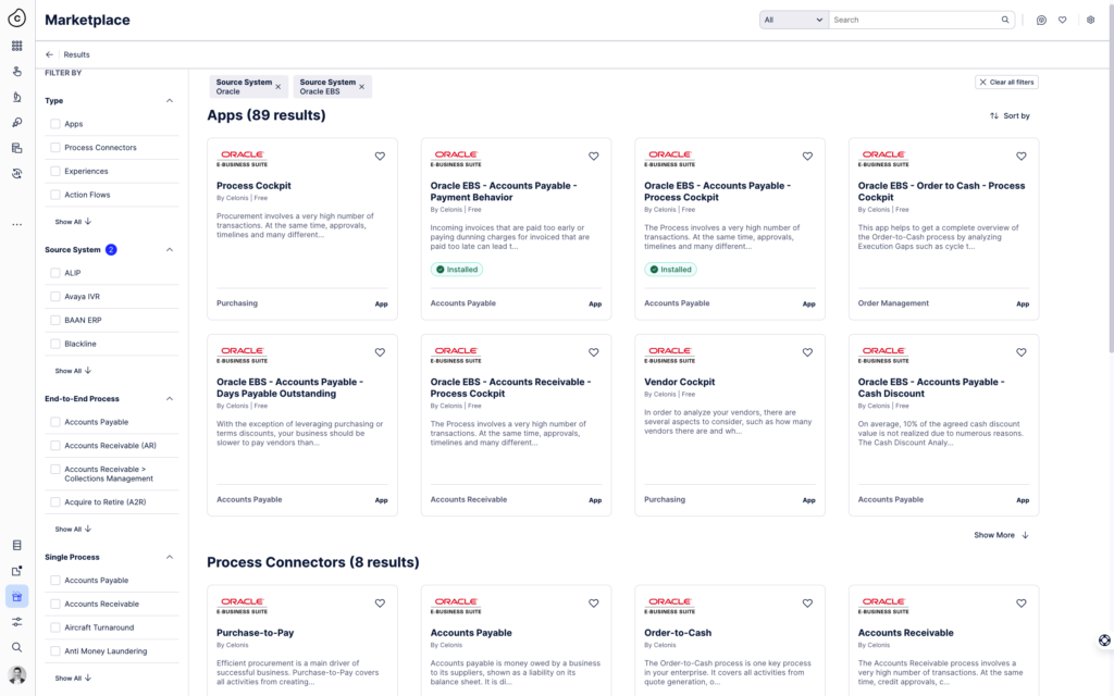 Through our unique collaboration with Celonis in 2016, we have developed 8 different process connectors and dozens of out-of-the-box Apps especially for Oracle EBS and Oracle Cloud ERP customers. You can install these assets free of charge from the Celonis MarketPlace.